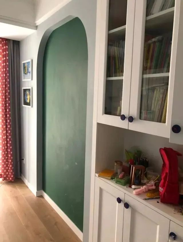儿童房里左边布置了一张单人床,里面直接买了一个衣柜,以后不想要了或者想换其他柜子都方便。推拉门后面与阳台相通。设计师设计的儿童房墙面刷了蓝色硅藻泥,显得很有档次,床和床品也是蓝色的,很统一。利用一面墙做了黑板墙,方便孩子涂涂画画。右边做了上下两层的书柜,也很实用,书柜上的书希望能让孩子从小就喜欢阅读。
