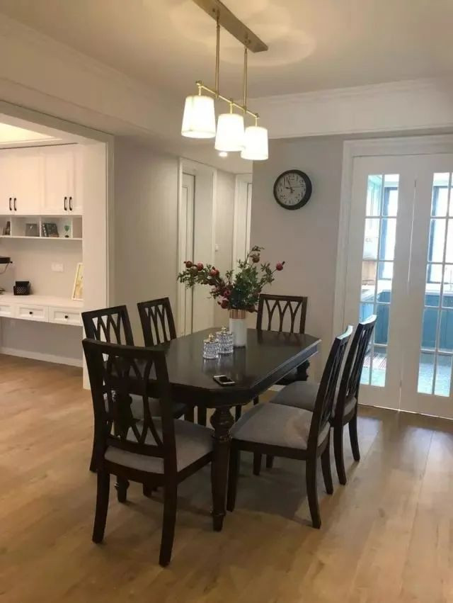 餐厅布置了一张相对较小的方形餐桌,实木餐桌非常耐脏,棉垫的餐桌椅坐着很舒服,也显得很大气。餐桌虽小,但平时也足够我们一家人使用了。