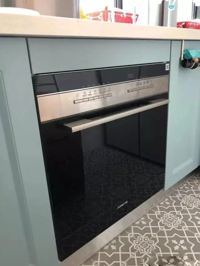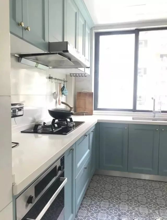 厨房可以说是我们家的颜值担当,定制的橱柜和地面铺的瓷砖都非常漂亮。大理石的橱柜桌面容易打扫,也很大气。厨房的窗户很大,采光特别充足。我们还放弃了一个橱柜改做了洗碗柜,虽然一开始不太想要,但老公坚持安装了,估计以后会有用。