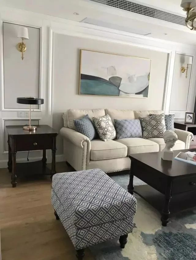 沙发墙挂着一幅长方形的装饰画,起到了很好的装饰效果。沙发背景墙贴了石膏线条,两边还安装了壁灯,晚上可以当辅助灯光使用。旁边放着一张蓝色花格子的凳子,与抱枕的颜色相近,坐着很舒服。客厅没有做任何复杂的造型电视背景墙,直接用原墙做背景墙我们也很喜欢。顶面做了吊顶,安装了中央空调,既实用又大气。全屋地面铺的实木地板,比瓷砖更显温馨,效果也更漂亮。