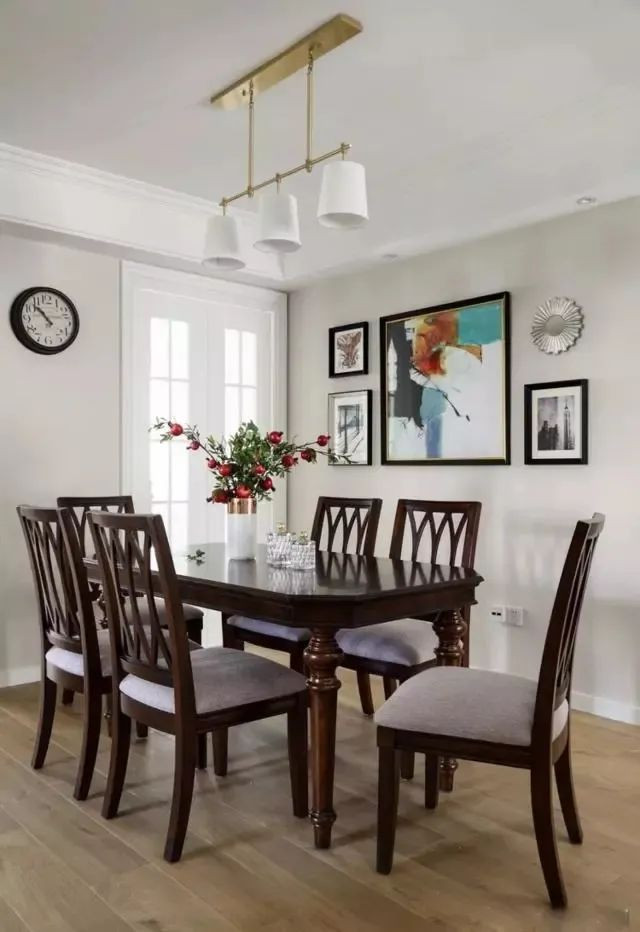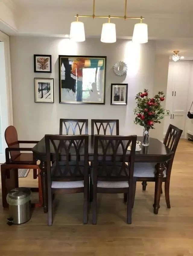 餐厅墙上的装饰画是设计师帮忙搭配的,一幅大的搭配三幅小的,非常好看,吊灯也很有个性,金色显得很时尚。