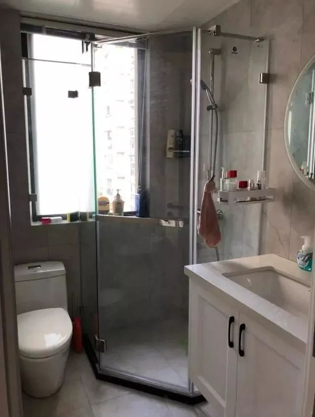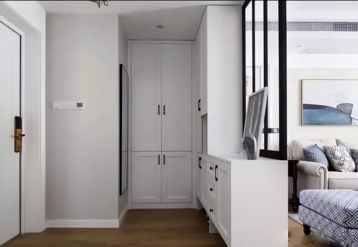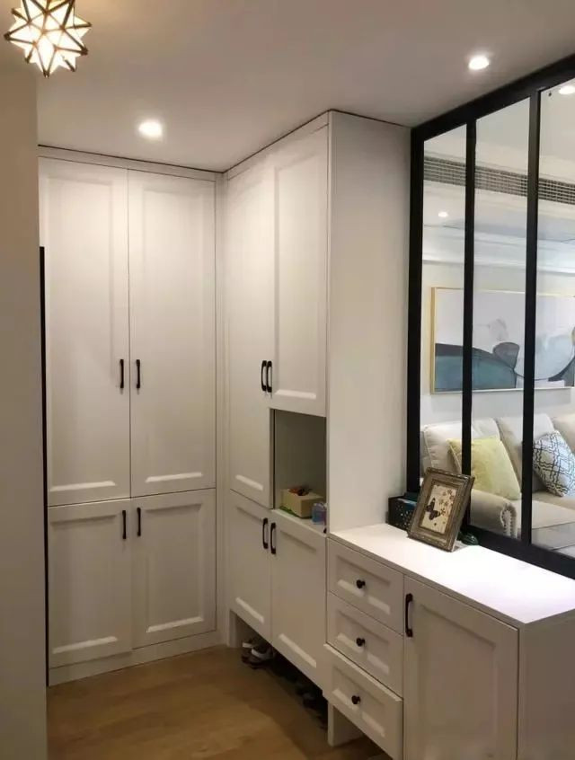 因为入户大门直接正对着客厅,从风水上来说不太好,所以设计师设计了现在这个隔断柜,上面用玻璃做隔断,既美观又实用,还解决了风水问题。玄关鞋柜下面留空,平时常穿的鞋子可以直接放进去,不用再麻烦地打开柜门。鞋柜中间也留了一小空间,方便放钥匙等小物件,非常实用。家里的柜子都是定制的,包括玄关柜,提供了充足的储物空间,质量和做工我们都很满意。
