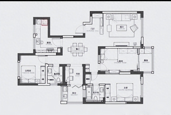 先来看看我家的平面户型图,面积一共 135 平,是 3+1 的户型,属于现代美式风格。户型还算不错,方方正正的,而且室内动静分区合理,装修时也不需要拆墙与砌墙,为我们省了不少事。