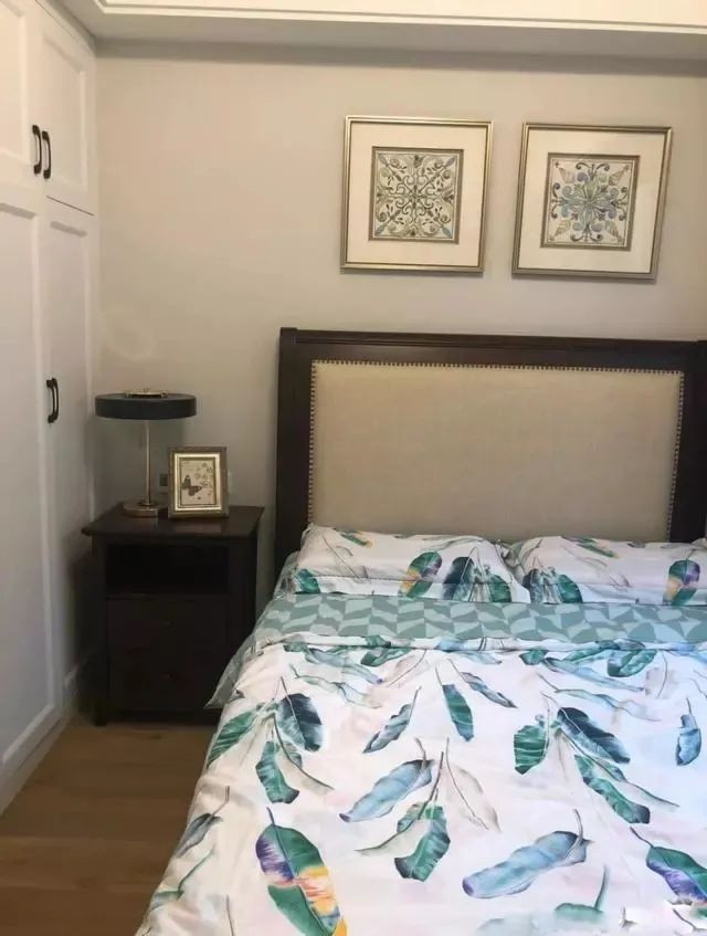 次卧的床头墙上挂着两幅装饰画,很有艺术感。