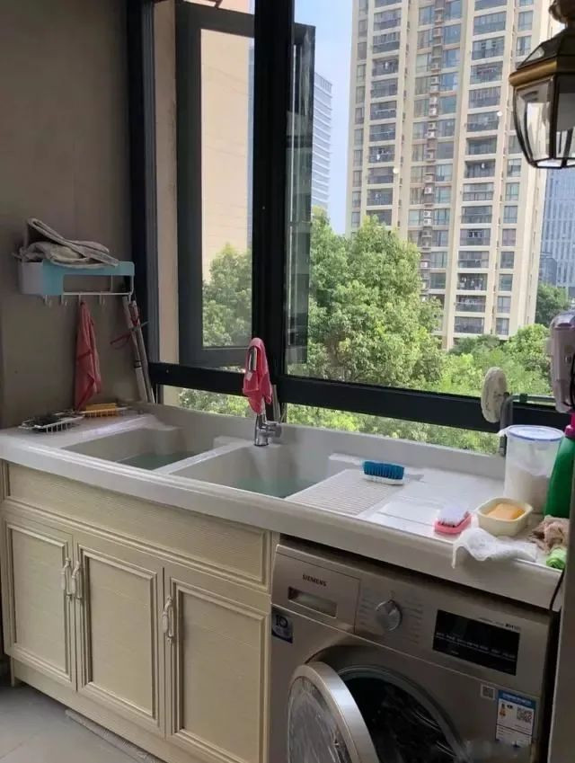 阳台上打了两个水槽的洗手池,使用很方便,右边还留出空间放了洗衣机,很有设计感。